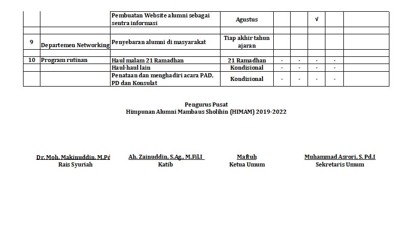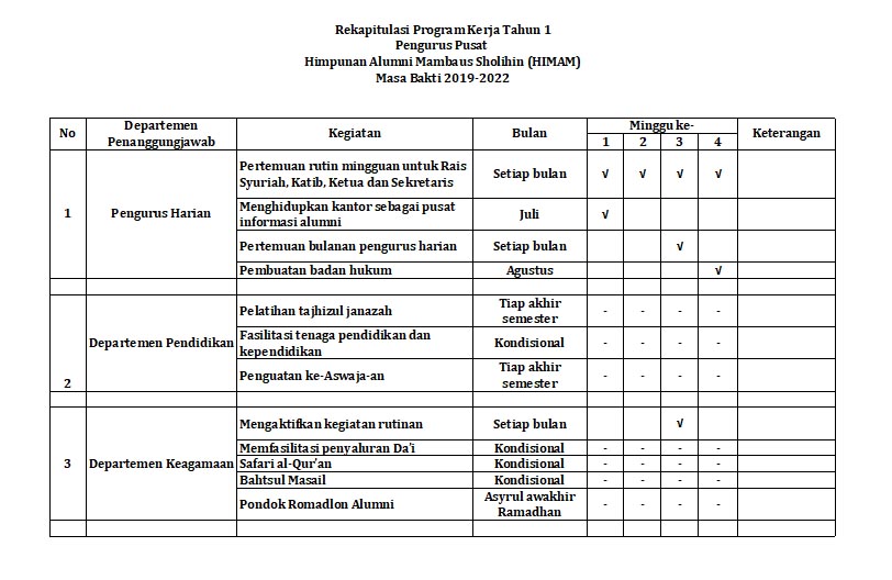 Rekapitulasi Program Kerja Tahun 1 Pengurus Pusat Himpunan Alumni Mambaus Sholihin (HIMAM) MBSadmin August 5, 2019 Profil HIMAM Putra, Profil HIMAM Putri 1,759 Views Share Facebook Twitter Stumbleupon LinkedIn Pinterest